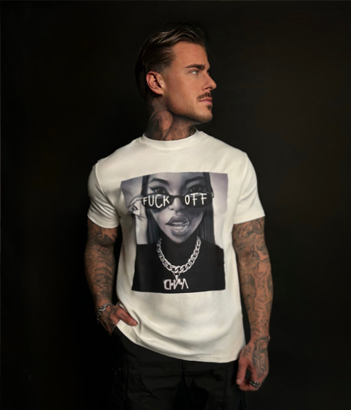Dominantní černobílý print stylizované ženy se zakrytýma očima a nápisem F*CK OFF vytváří jeden z nejvýraznějších motivů celé kolekce.